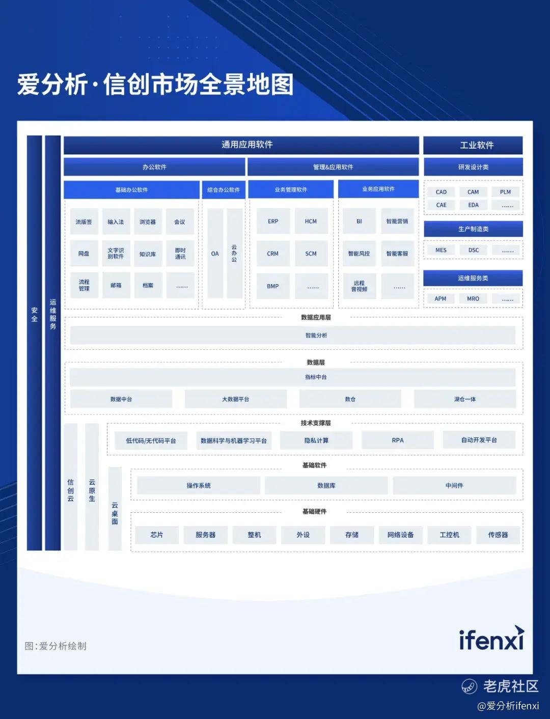 本次报告中,爱分析按照IT架构,自下而上将信创市场划分为:基础硬件、基础软件、技术支撑层、数据层、数据应用层、上层应用软件等六个层级。其中基础硬件包含芯片、服务器、整机、外设、存储等;基础软件包含操作系统、数据库与中间件;技术支撑层包含低代码/无代码平台、数据科学与机器学习平台、隐私计算、信创云、云原生、安全等;数据层包含指标中台、数据中台、大数据平台、数仓、湖仓一体等;数据应用层包含智能分析;上层应用分为通用应用软件与工业软件,涉及办公、管理及应用、研发设计、生产制造等多个细分场景。