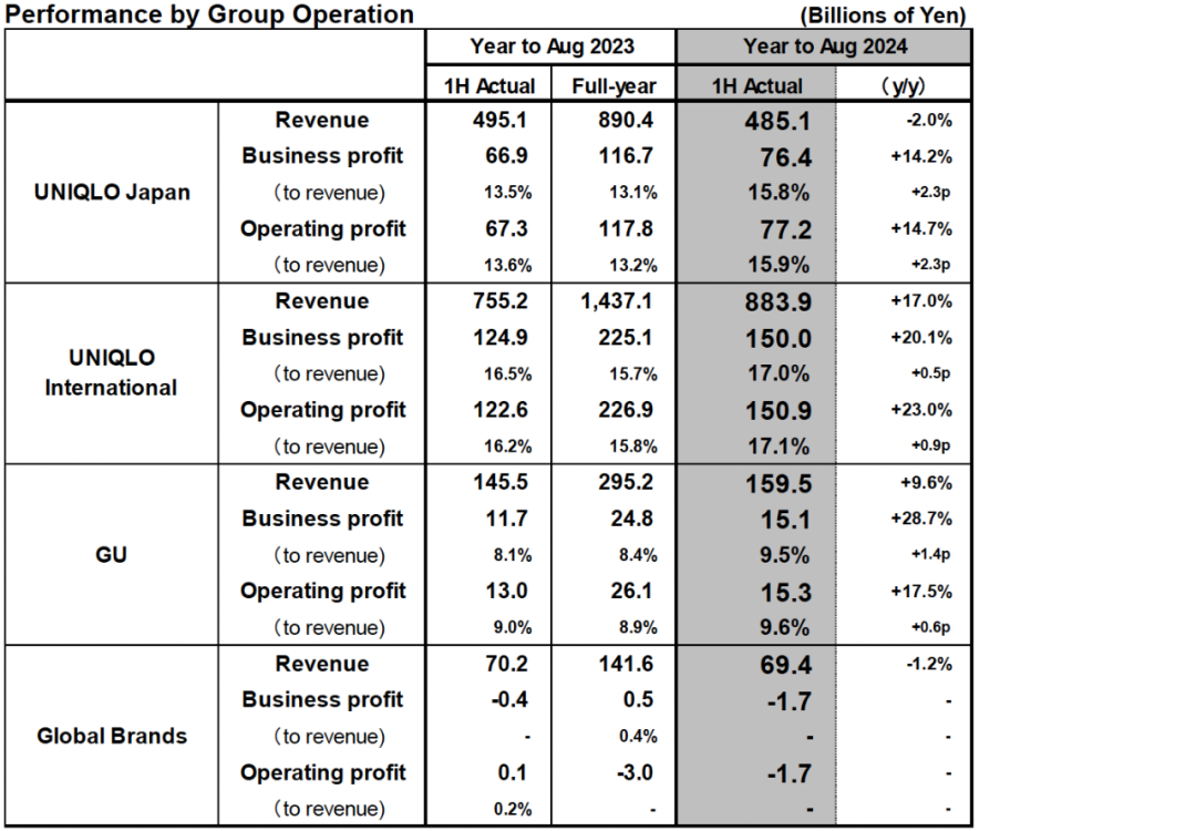 Uniqlo优衣库国际市场上半年收入8,839亿日元同比增幅17.0%,毛利率同比提高110个基点至55.1%,营业利润率17.1%同比提高90个基点,营业利润1,509亿日元同比增加23.0%。