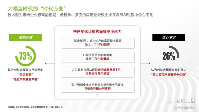 大模型时代,技术快速发展,企业面对随之而来的巨大发展机遇,在抱有极高预期的同时,也存在信心不足的情况。德勤中国数智研究院主管合伙人尤忠彬带来了《以“内功不变”应“时代万变”——大模型时代企业的制胜之道》的精彩分享,他指出,在快速变化的 AI 时代,企业应当保持定力,持续围绕战略、人才、风险、数据、生态等“不变”关键要素重点建设。