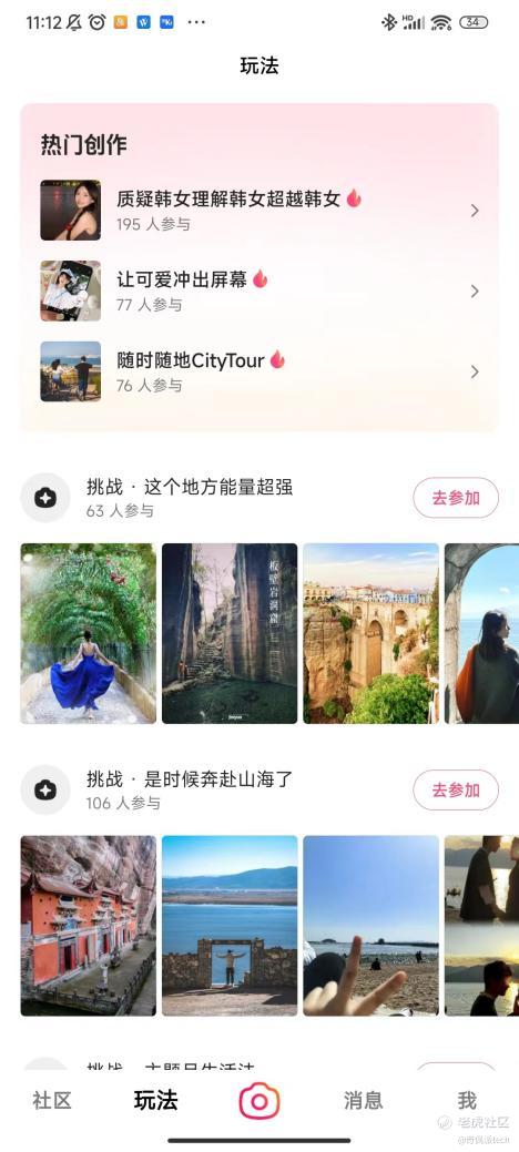 此外,可颂底部导航栏还有“玩法”功能,可以点击“热门创作”或“挑战”进行该类话题参与,类似于小红书的热点玩法。