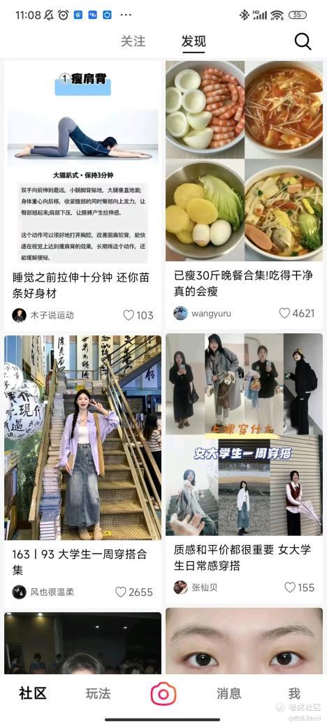点开可颂APP后,呈现的是双列瀑布流展示的内容界面。内容界面分为关注和发现列表,发现列表中的内容由系统根据用户的爱好自动推荐,关注列表则会展示用户关注的创作者所发布的内容。内容形式以图文及视频为主,主要来自抖音APP和可颂APP用户创作的内容。而整体内容风格、社区氛围与小红书非常相似。即主打穿搭、美妆、旅行、本地生活攻略与教程等。