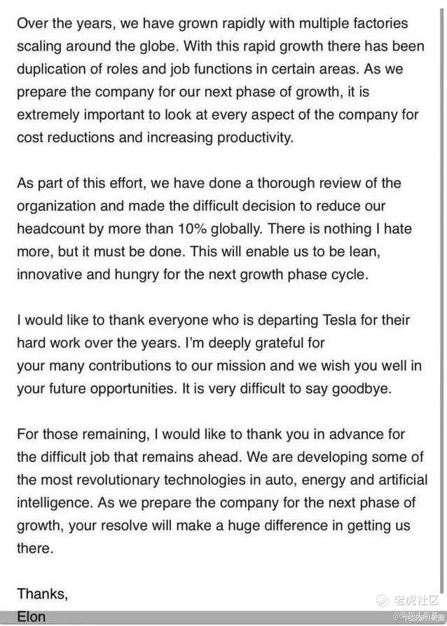如马斯克昨日发布了一份内部邮件宣布裁员,马斯克表示:经过彻底审查,做出艰难的决定,将全球员工人数减少10%以上,以削减成本并提高生产率。