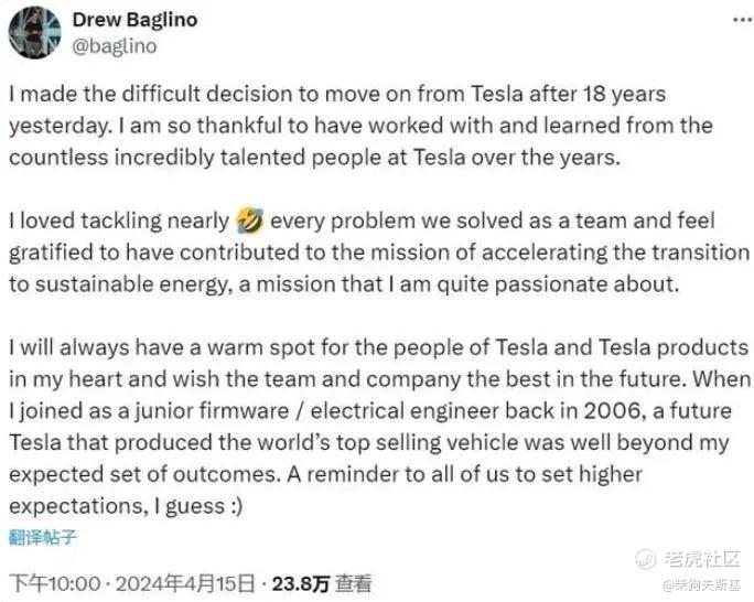 与此同时,特斯拉又传出人事动荡。动力总成及能源业务高级副总裁德鲁・巴格利诺(Drew Baglino)在社交媒体平台 X 上发文宣布离开效力18年的公司。