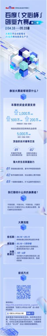 大模型开启创新曙光,AI应用释放新质生产力。第二届百度“文心杯”创业大赛重磅来袭,诚邀全球有志之士,共建AI大模型黄金时代。
