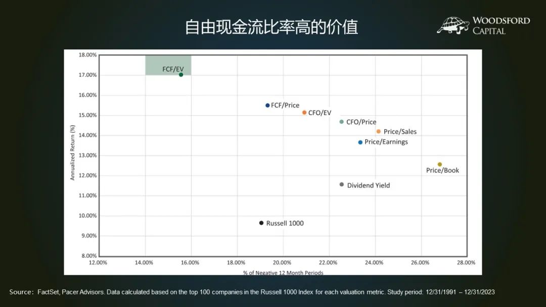 比如基于过去32年(1991-2023)的统计显示,如果持续选择那些自由现金流比率最高的公司组成投资组合,那么投资者可以获得平均每年17%的回报,并且连续12个月亏钱的概率也比较低(不到16%)。这个回测回报,比其他一些常见的选股指标(比如营业现金流比率、分红率、市净率、市销率等)选出的股票组合的回测回报更好。