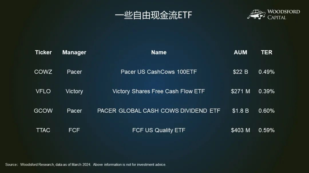 正是因为这个原因,市场上有一些ETF,专门以筛选自由现金流比率比较高的公司为投资策略,供投资者选择。在这里,我为大家简单介绍几个。