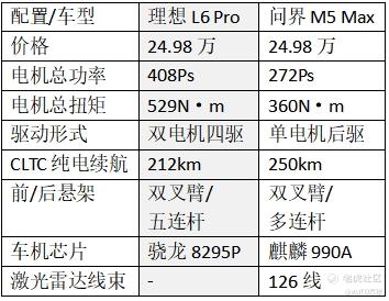 M5低配Max版有激光雷达,但没有四驱,功率和扭矩比L6Pro小不少。