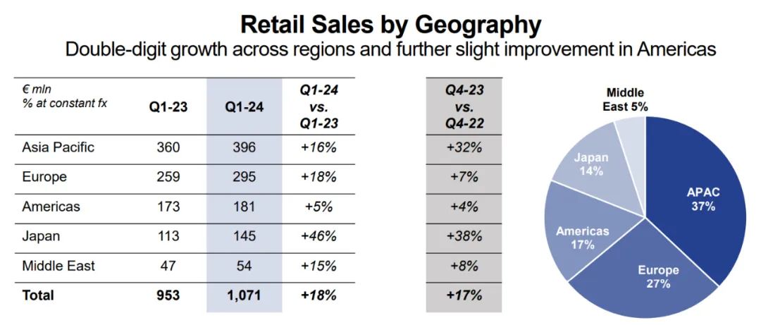 两间巨头的表现主要受亚太市场,特别是中国市场拖累,而Prada SpA普拉达集团一季度亚太市场录得10.0%的零售销售增长,固定汇率增幅更高达15.7%至3.962亿欧元,欧洲和美洲市场则分别录得18.1%和5.0%的增幅,日本市场增幅更高达45.6%。