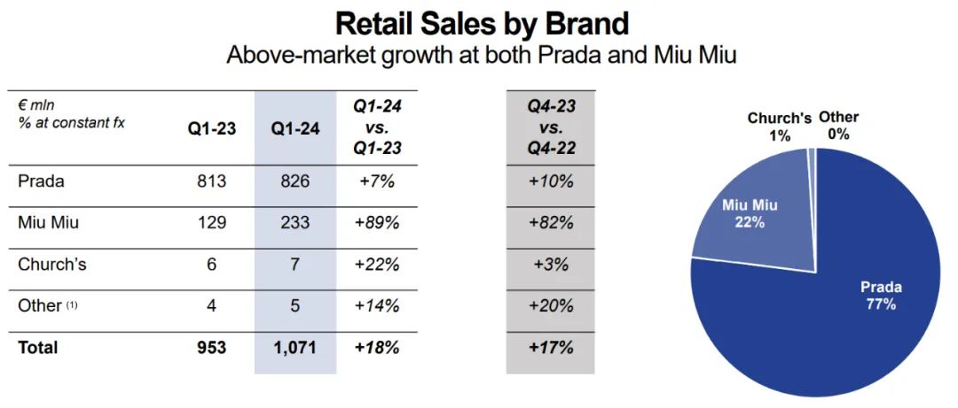 一季度Miu Miu零售销售飙升80.2%至2.332亿欧元,固定汇率增幅89.4%,强劲的表现甚至较上年四季度进一步提升。Prada品牌首季度收入增加1.6%至8.263亿欧元,固定汇率增幅6.5%。