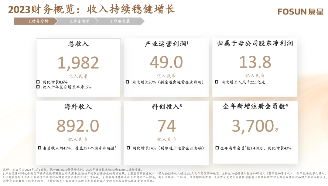 然而,上述只是发展成果的一部分。总结2023年,复星通过聚焦主业战略推动了业务稳定增长,四大核心子公司豫园股份、复星医药、复星葡萄牙保险和复星旅文,总收入同比增长8%;产业运营利润达49亿元,同口径同比增长20%;归属股东净利润达13.8亿元。