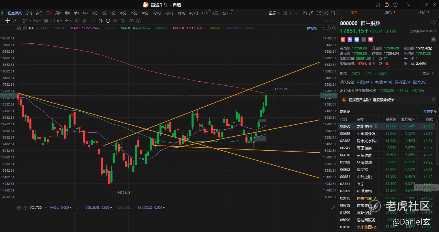 $恒生指数(800000.HK)$ 港股最近真的是强到没朋友,3月初我牛牛圈反复聊港股可以看涨,反弹确认,而且是非常大的底部,当时那家伙,一堆人追着骂,我说没关系,时间会应验答案,大家知行合一做交易就好了。现在涨起来了,各路观点和上涨理由都出来了,交易,不是事后去找答案的,都是需要提前做预案和应对的。