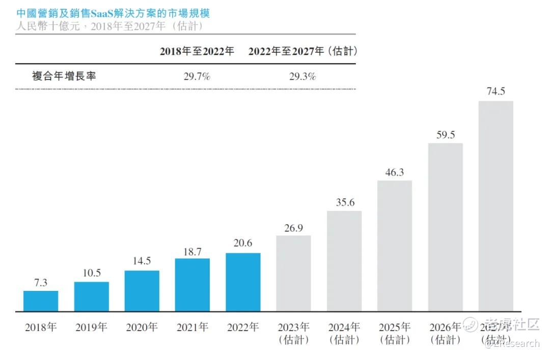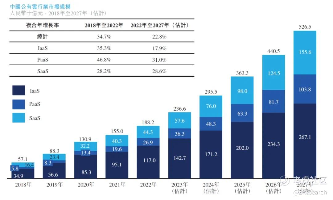 根据弗若斯特沙利文的报告,中国SaaS市场的收入从2018年的164亿元人民币增长到2022年的443亿元人民币,显示出2018至2022年间的复合年增长率达到了28.2%。得益于市场需求的持续增长、产品功能的持续改进以及政府对数字经济的积极政策支持,预计到2027年,中国SaaS市场的收入将增长至1,556亿元人民币,预测2022至2027年间的复合年增长率为28.6%。此外,PaaS(平台即服务)市场的扩展也成为公有云市场增长的一个关键驱动力。众多SaaS供应商开始扩大其PaaS服务的范围,因为PaaS为客户提供了额外的价值。通过使用PaaS平台作为低代码的开发工具,企业能够以更高的敏捷性、更短的开发周期以及减少所需的IT工程师人数,来开发定制化应用程序。