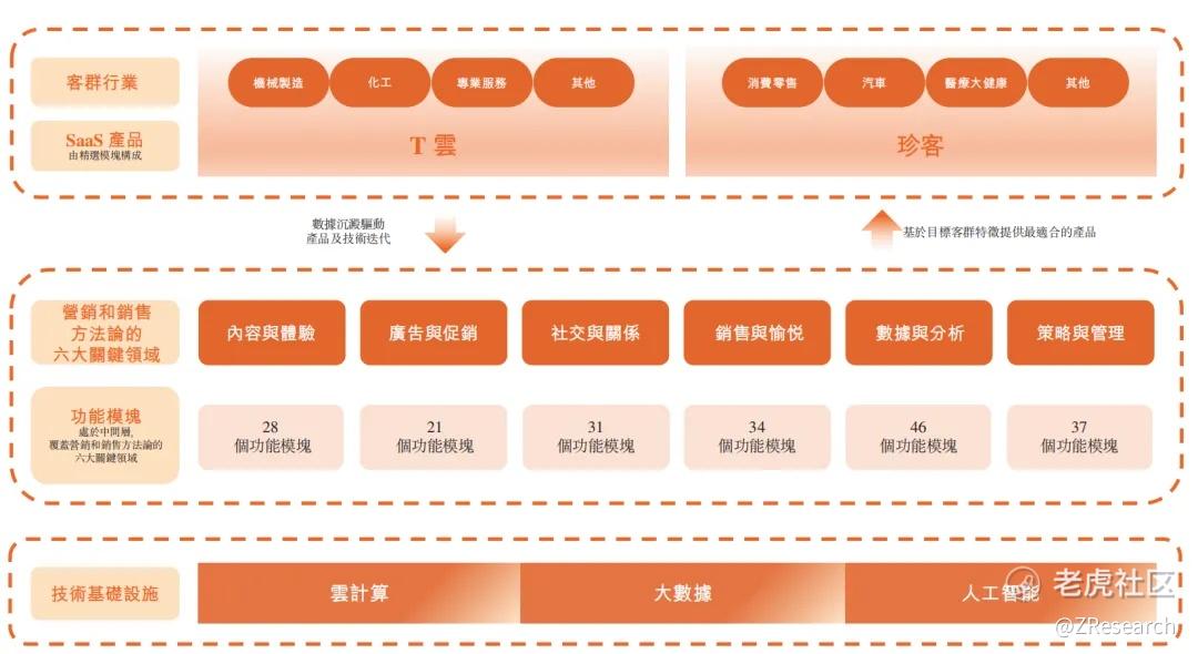 迈富时的核心竞争力体现在其创新的Marketingforce平台,该平台整合了云计算、大数据分析以及人工智能等关键技术。Marketingforce平台提供多达202个功能模块,这些模块不仅体现了公司在营销领域的深厚经验,而且覆盖了从内容创作、分发、到数据分析和整体战略规划的营销与销售全周期。目前,公司已开发出T云及珍客等SaaS等产品。SaaS业务包括T云和珍客等产品,T云是一个营销平台,提供营销内容生成和发布服务;珍客则是一个资源管理平台,帮助客户管理销售团队并促进客户转化。精准营销服务则为客户提供包括流媒体广告投放和广告内容制造在内的综合广告服务。