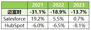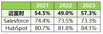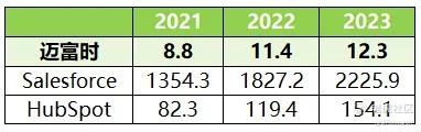 本次选取的可比公司是Salesforce和HubSpot。Salesforce成立于1999年,作为全球领先的客户关系管理(CRM)技术提供商,Salesforce将公司与客户紧密联接,提供全球性的CRM技术;HubSpot是一家提供基于云计算的CRM平台的公司,旨在帮助各种规模的企业跟踪和培育潜在客户以及分析业务KPI,总部位于美国马萨诸塞州。综合各方面数据来看,迈富时总体规模不算大,劣于俩家企业。毛利率方面,2021-2023年期间迈富时平均为55%,Salesforce和HubSpot分别在73%和81%水平,俩者差距较大。净利率方面,仅有Salesforce不是亏损。总体而言,迈富时规模较小,各项指标均劣于同比公司。