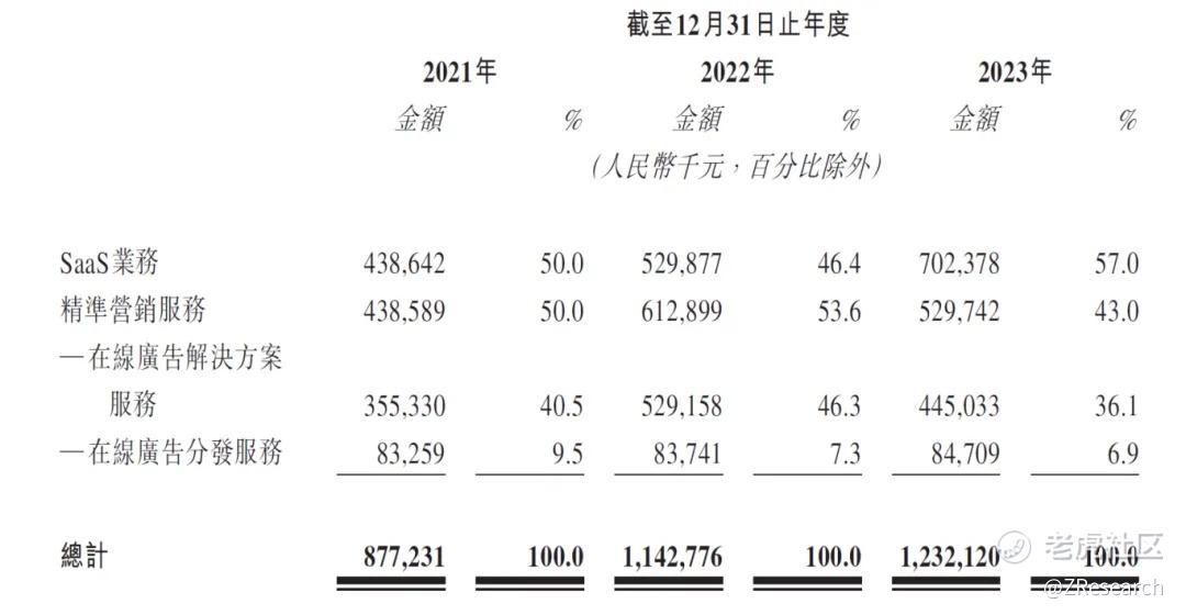 迈富时管理的收入主要来源于SaaS业务和精准营销服务,SaaS业务是公司的核心技术。2021-2023年,公司分别有50.0%、46.4%及57.0%的收入来自SaaS业务,50.0%、53.6%及43.0%的收入来自精准营销服务。但SaaS业务的毛利率是高于精准营销服务的,分别为87.7%及17.0%。显然,SaaS业务的盈利能力显着强于精准营销服务。