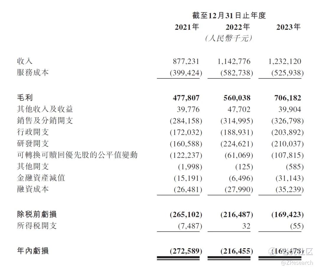 尽管营收增长稳定,但其盈利能力却不及预期。2021-2023年,迈富时营业收入为8.77亿、11.43亿和12.32亿元,净亏损额为2.73亿、2.16亿和1.69亿元,亏损的主要原因是在快速扩张SaaS业务过程中产生大量研发开支、行政开支和销售及分销开支。