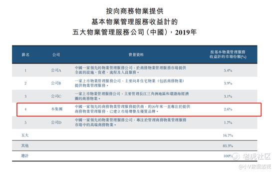 以2019年的收益计算,在商务物业管理这个赛道上,公司排名第4,占比2.6%,于此对比,第一名的占比为5.4%;同时行业前5名占全行业的16.7%