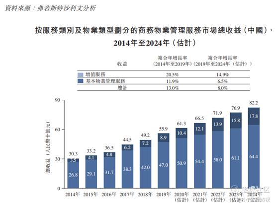 根据弗若斯特沙利文报告,过去5年,按收益计算,商务物业管理服务市场的复合增长率为13%,预期未来5年仍以8%的增速发展。
