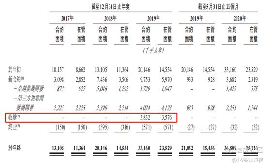合约面积方面(包括实际在管+已经签订管理合同),在2017年为13105,2018年为20146,增长54%;到了2019年为33160,增长65%;但是这里有3832是收购所得,若去掉这3832,则增长46%。