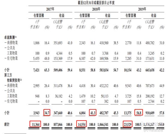 在管物业分两部分,一部分是卓越集团开发的物业(爸爸给的生意),另一部分是第三方开发的物业(自己拓展的生意)。过去3年,爸爸给的生意从65%下降到43%,而自己拓展的生意从35%增长到57%。