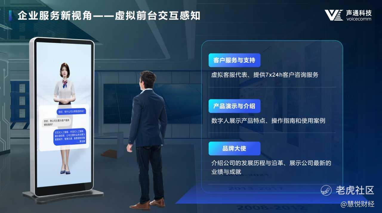 虚拟数字人产业纵深长,市场需求旺盛,未来发展空间广阔。而声通科技的AI虚拟人交互未来可拓展应用于多个场景,包括:会展发布的创新会议模式、文旅融合智慧IP、企业服务的虚拟前台交互感知、医药门店的关怀问答专业推介等。