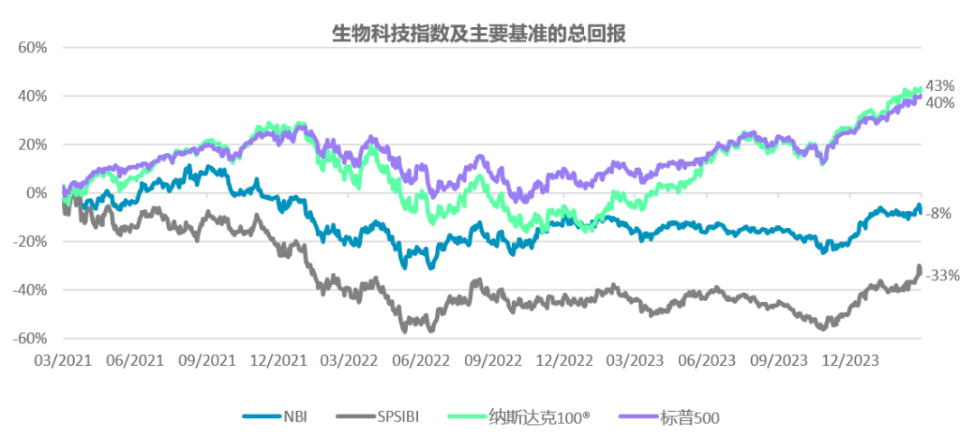 纳斯达克生物科技指数(NBITM)于1993年11月1日推出,当时正值生物科技行业的萌芽阶段。截至2024年2月底,NBI共有221只成份股,作为修正后的市值加权指数,NBI确保其回报按比重由最大及最重要的生物科技公司所驱动。截至2024年2月29日止的三个年度,NBI温和下跌8%,但遥遥领先标普生物科技精选行业指数(SPSIBI) 25个百分点。SPSIBI是修正后的等权重指数,仅由118只成份股组成。