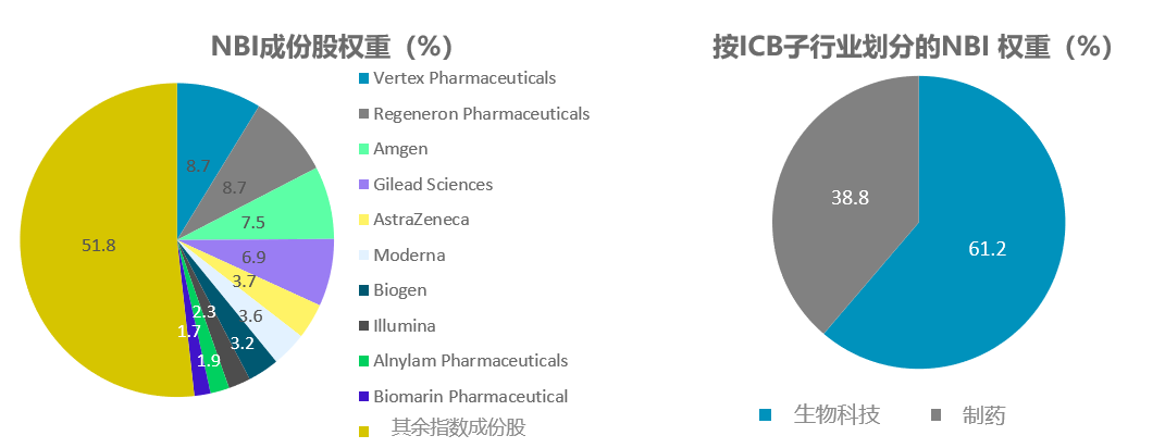 于季度调整期间,NBI五大成份股的权重上限分别为8%,其余成份股的权重上限则为4%。截至2024年2月底,10大成份股占指数总权重的48.2%。根据行业分类基准(ICB)分类,61.2%的成份股划分为生物科技子行业,其余成份股则划分为制药子行业。