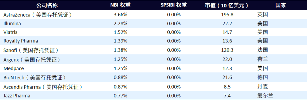 当比较所涵盖的证券范围时,NBI的独特之处在于其包括来自任何注册国家的公司,而SPSIBI则仅专注于美国公司。这种涵盖范围使NBI内的非美国类别能够扩展,该类别包含42家公司,占指数总权重的15%。以下为10家不在SPSIBI的最大公司,其中六家设于美国境外。