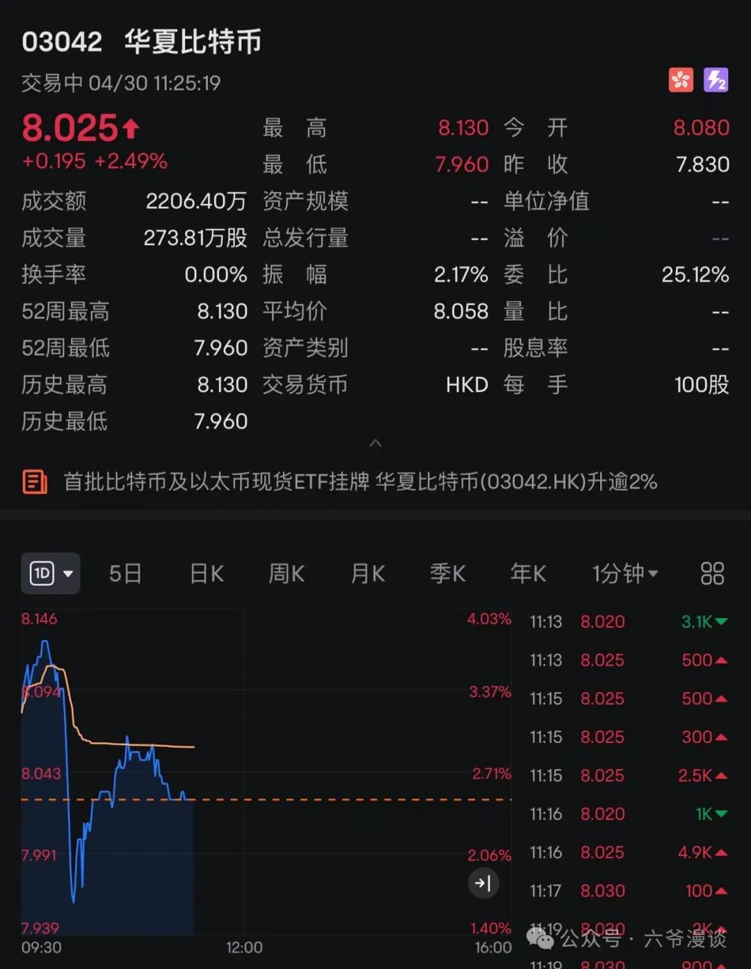 2、香港的比特币、以太坊ETF今天正式挂牌交易了,趋势也是随现货走。我估计会有些溢价,不过app还没显示出来。