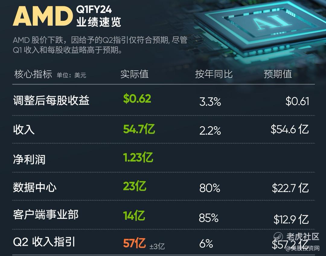 对于 $美国超微公司(AMD)$ 来说,虽然一季报表现优于预期,数据中心收入激增,这主要得益于AI芯片销售的大幅增长,同时其客户端收入也因PC市场的复苏而同比增长80%。