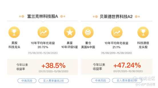 本次定投功能上线,除了实打实的money折扣,小虎还为大家精挑细选了各个行业的代表优质基金,首场科技专场打头阵的是富兰克林科技股A和贝莱德世界科技基金A2,截止2020.9.15号彭博的数据,这两支基金10年以来的平均年化收益超过20%。