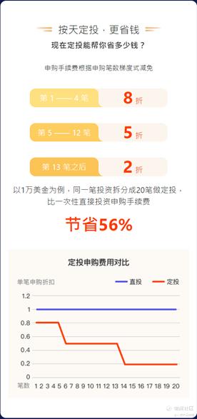 为配合此次定投功能上线,老虎基金超市特别推出了定投的好伴侣——定投申购费专享折扣。定投次数越多,折扣越大,费率最低达至2折,所以按天定投更省钱~
