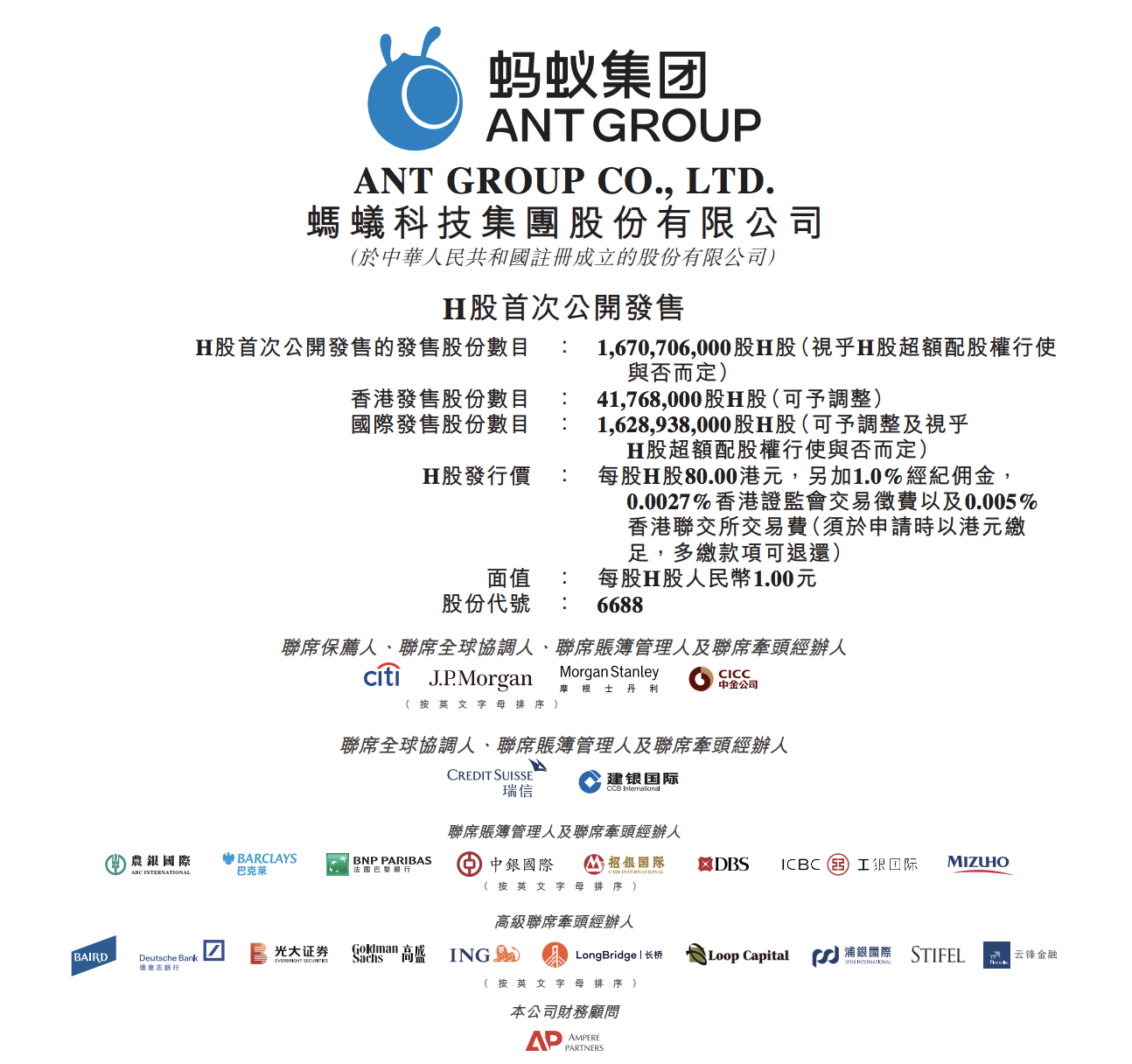 蚂蚁集团港股预期将于2020年10月27日(星期二)开始香港公开发售,于2020年11月5日(星期四)上午开始于香港联交所买卖。