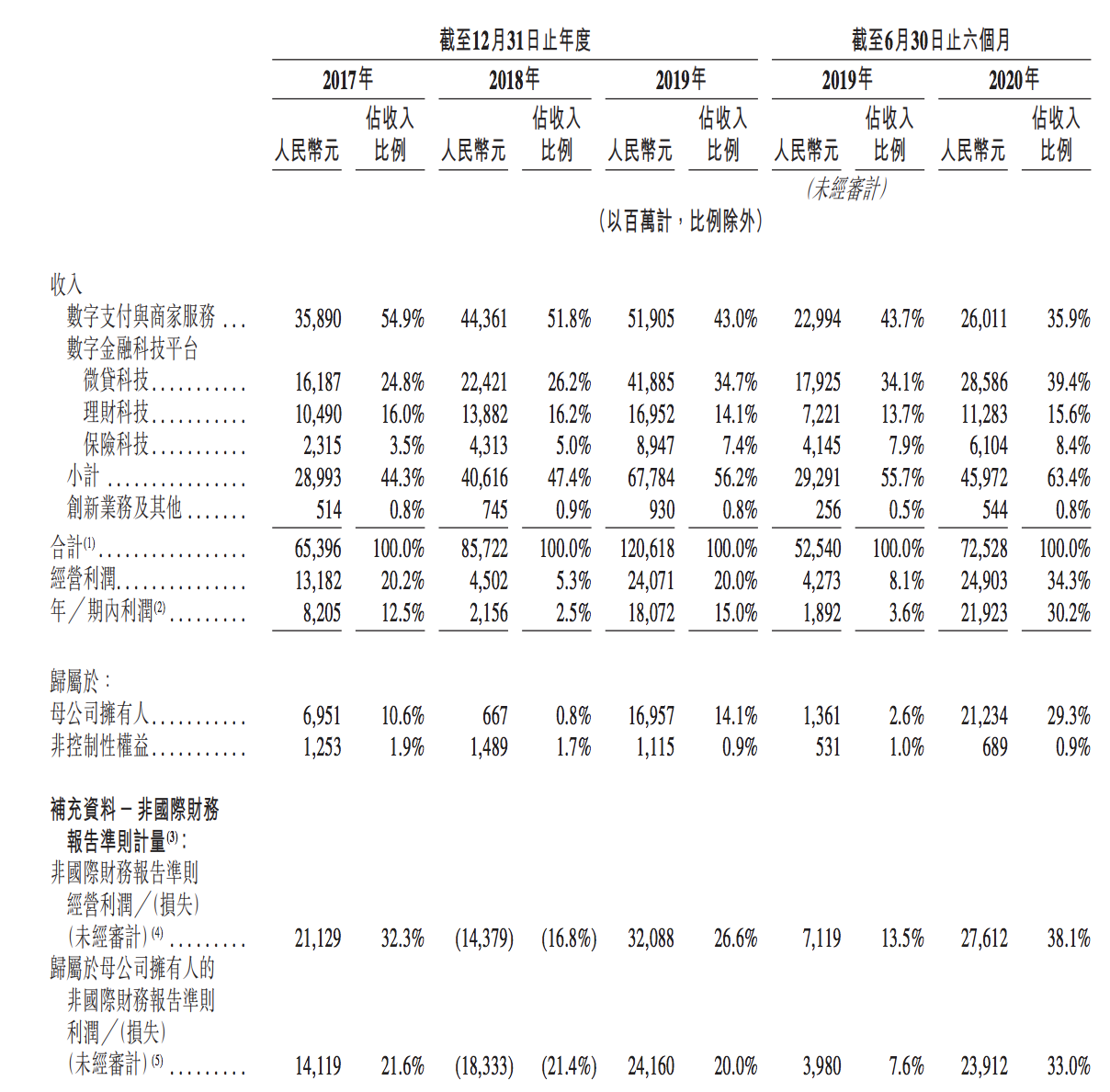 招股书显示,蚂蚁集团2017年、2018年、2019年营收分别为653.4亿、857亿、1206亿;净利润分别为82亿元、21.56亿元、180.72亿元。蚂蚁集团2020年上半年营收725.28亿,净利润为219亿元。