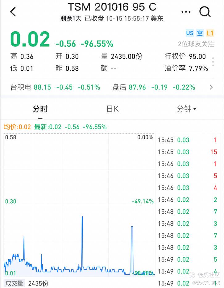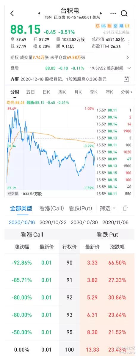 一定要做点什么解解气。立即查看10月16号周五到期的期权,这就是俗称避之而不及的末日轮(基本上时间价值就是期权的价值,然后还会快速耗损到0,所以买入操作很不划算)。之所以没有看隔周和1个月后的期权,是因为生气归生气,但是毕竟不算完全了解半导体产业,股价下跌可能另有原因,所以没有再次看多的信心。但是今晚财报利多是事实,这个对于短期的价格一定有影响。