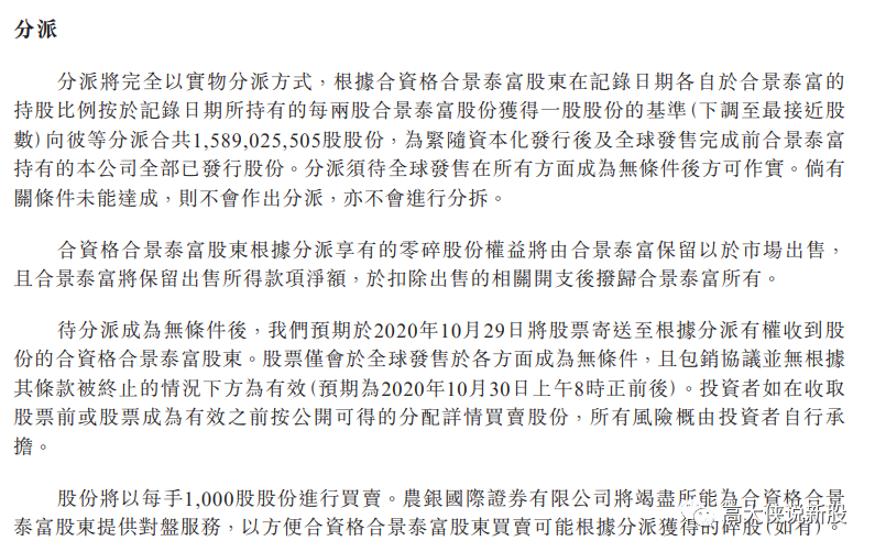 ②有条件分派:每持有2股股份获派发1股合景悠活股份;即全体合景泰富股东能够按照2:1的比例获取合景悠活股票;港股通 与香港投资者共享派股;此部分为约为15.89亿股。
