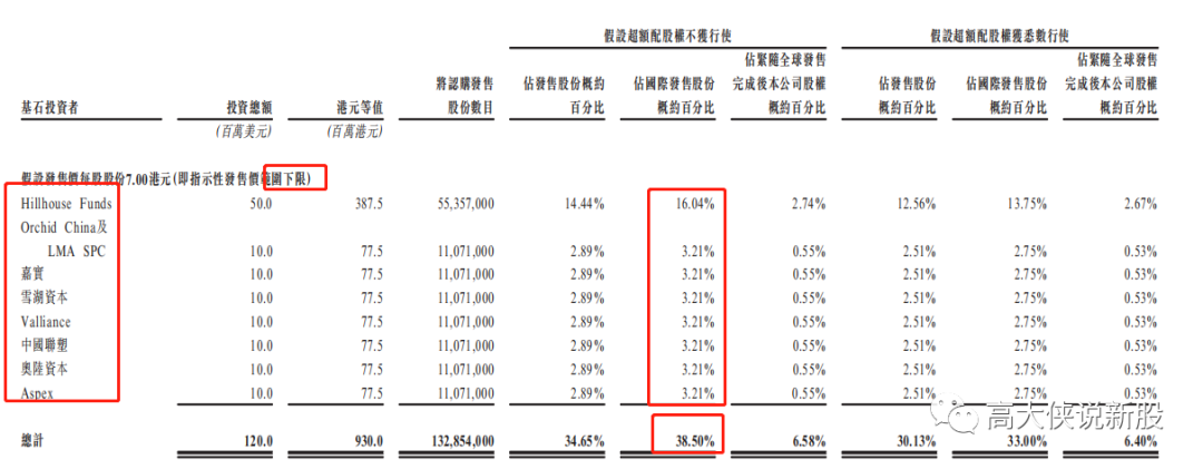 基石:9名基石,Hillhouse Funds(高瓴资本)、Orchid China及LMA SPC、嘉实、雪湖资本、Valliance、中国联塑、奥陆资本及Aspex按发售价认购以合计1.2亿美元可购买的若干数目发售股份。按发行价下限计算,基石认购比例占国际发售38.5%,禁售6个月。