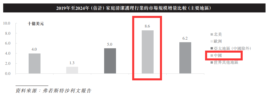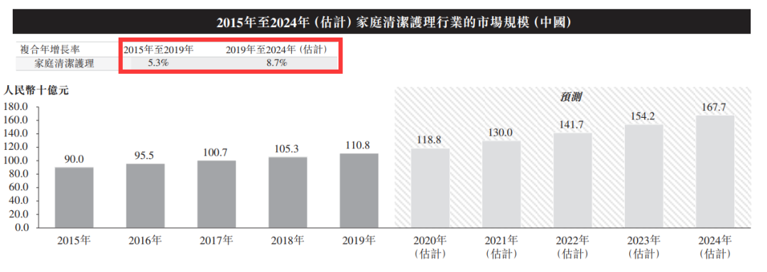 根据弗若斯特沙利文报告,中国家庭清洁护理行业的零售销售总价值有望继续增长,至2024年将达人民币1,677亿元, 2019年至2024年复合年增长率为8.7%,上述增量占2019年至2024年全球家庭清洁护理行业增量的三分之一以上。