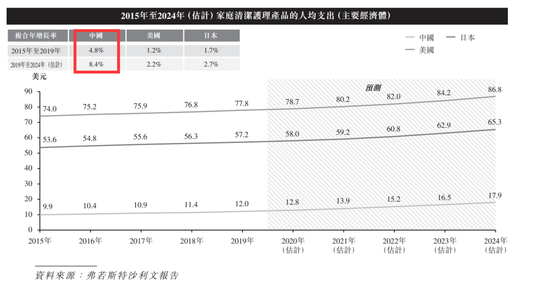 根据弗若斯特沙利文报告,中国家庭清洁护理产品的人均支出由2015年的9.9美元增至2019年的12.0美元,复合年增长率为4.8%。尽管中国的家庭清洁护理产品人均支出以往以及预计未来低于其他主要经济体(包括美国及日本),但其增速却高于该等经济体。由于中国消费者持续需要优质家庭清洁护理产品,预期到2024年,中国的家庭清洁护理产品人均支出将达到17.9美元。