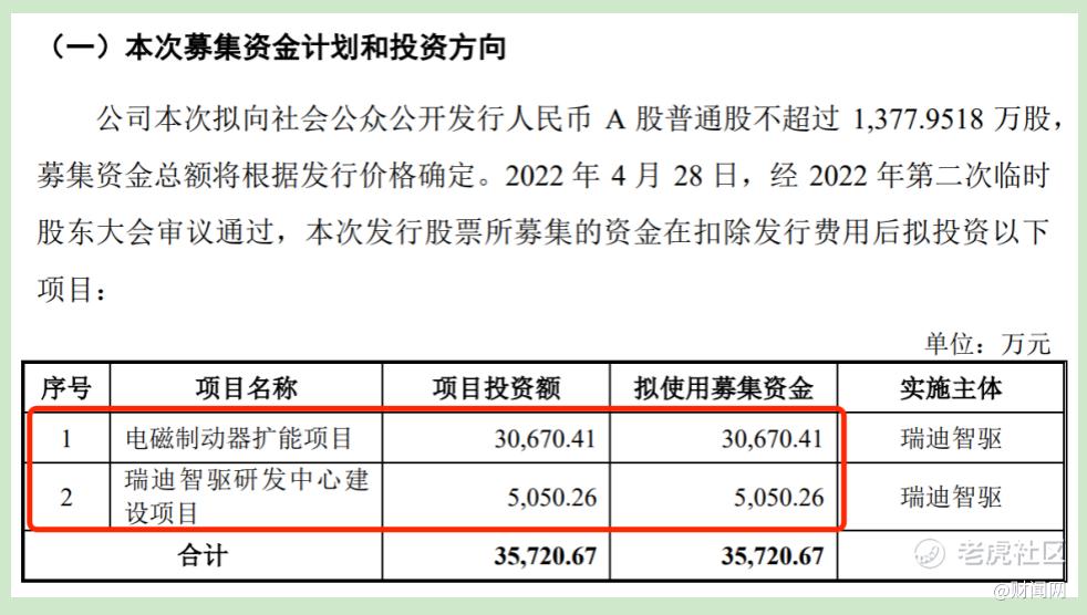 根据招股书披露,瑞迪智驱本次IPO募集资金计划和投资方向主要是用于电磁制动器扩能项目和瑞迪智驱研发中心建设项目这两个项目建设,其中,电磁制动器扩能项目总投资为30,670.41万元;瑞迪智驱研发中心建设项目总投资为5050.26万元。本次募集资金投资项目预计总投资额为 35,720.67 万元,而使用募集资金为 35,720.67 万元。