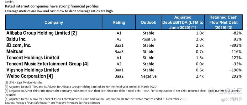 穆迪相信受评互联网公司面对挑战有一定缓冲。他们中的大多数都有与监管机构合作、解决分歧和做出改变而不损害其稳固业务状况的过往记录。这些公司还拥有强大的财务状况(图表1)和良好的融资渠道,这将有助于其应对近期的业务波动。