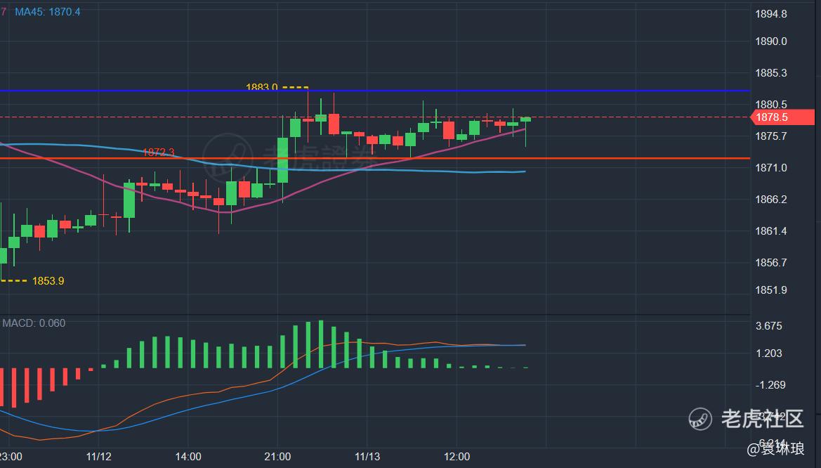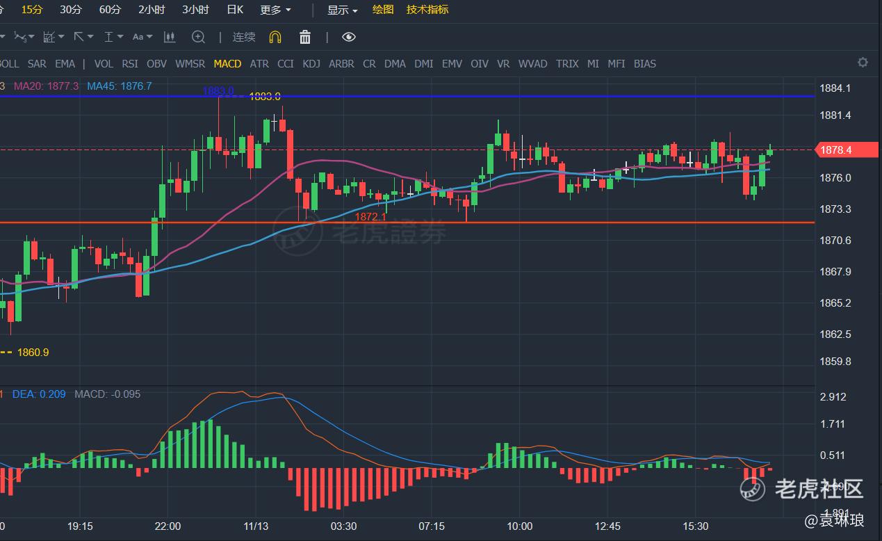 小时周期出现了1872-1883的平台整理走势,十五分周期观察多方有较强支撑,准备在1876附近买入。留意1883是否能强势突破,两小时内能站稳1883上方则持有,目标1900.