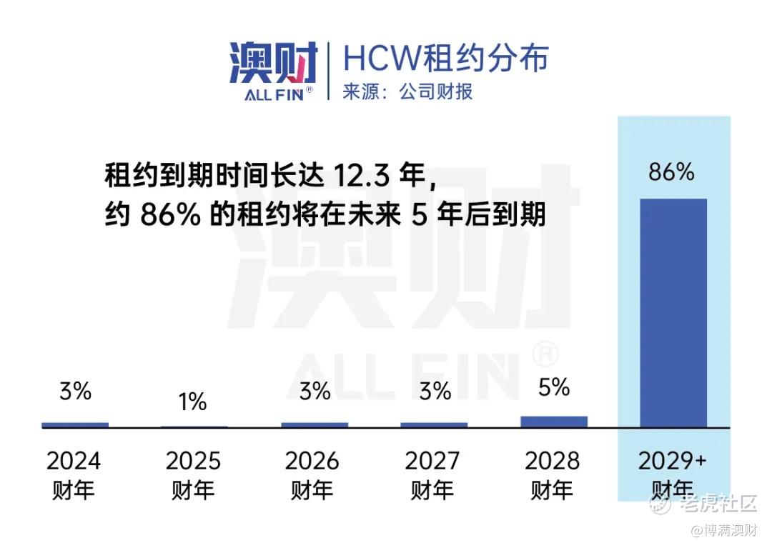 目前HCW出租的状态相当健康,空置率仅不到1%,有86%的租约为长期租约,签订至29财年以后。同时,为应对高通胀的影响,75%的租约都与CPI挂钩。其余25%的租约都以3%的增速每年上涨。