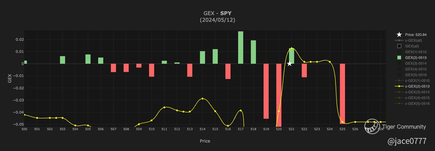 If price moves below 520, we can expect a strong pull towards 518-519. Depending on how the 0DTE options develops, price is likely to gyrate between 517 - 521. I'll stick to these levels and trade from these GEX green bars.