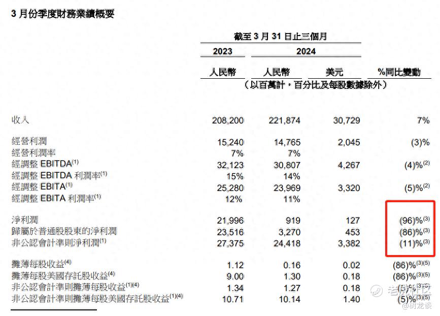 阿里Q1营收2219亿人民币,同比增长7%;净利润9亿元,同比下降96%。净利润大跌,阿里解释,主要是因为投资亏损。如果不考虑投资亏损、股权激励等项目,阿里的净利润为244亿,同比仍然下降了11%。
