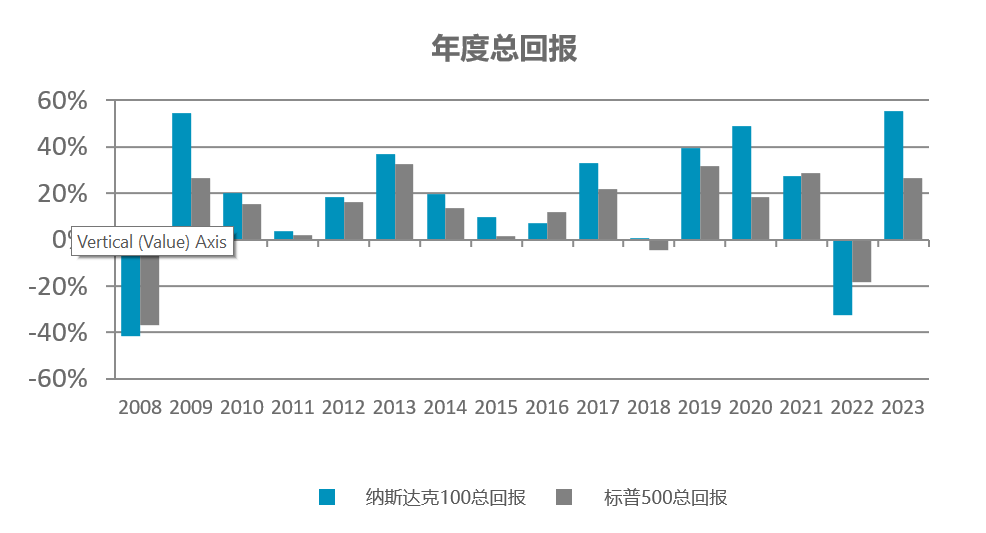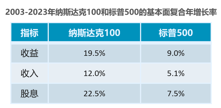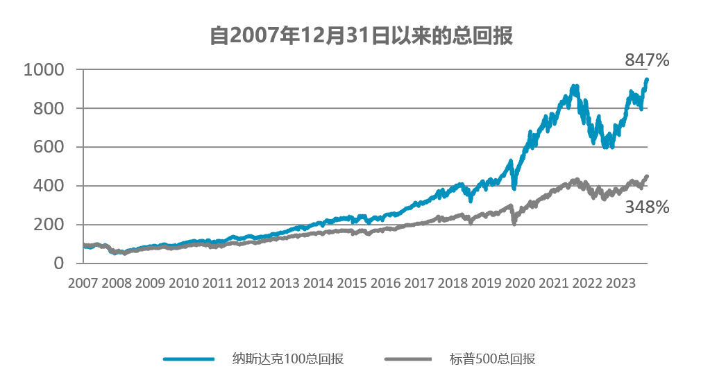 从2008年到2023年,纳斯达克100的累计表现比标普500高出2.4倍