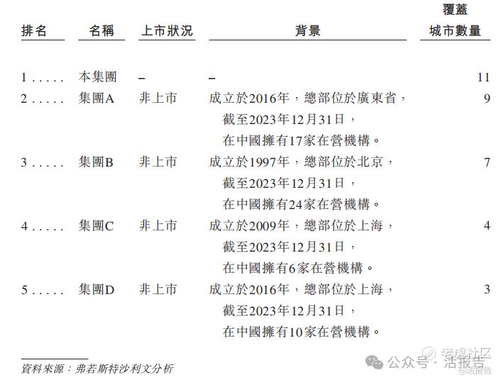 根据弗若斯特沙利文,截至2023年12月31日,按在中国覆盖的城市数量计,公司在所有私立中高端综合医疗服务机构集团中排名第一。此外,按2023年付费患者就诊人次及收入计算,公司在中国所有私立中高端综合医疗服务机构集团中分别排名第二及第三。
