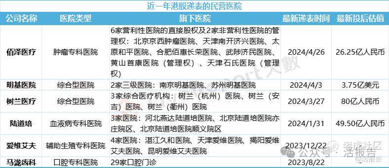 根据Livereport大数据不完全统计,近一年已有6家民营医院递表港交所,包括佰泽医疗、明基医院、树兰医疗、陆道培、爱维艾夫、马泷齿科。