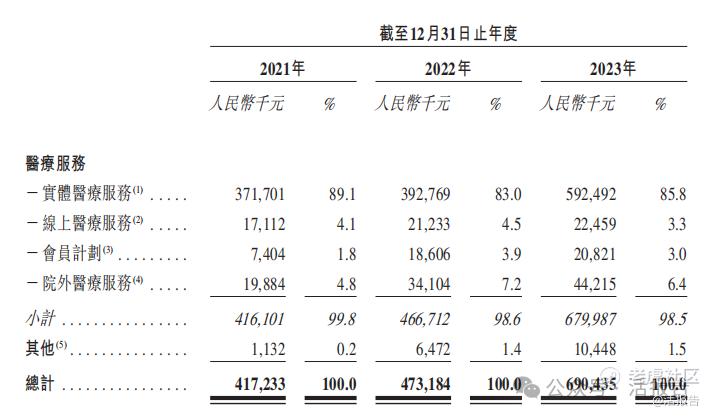 公司的收入主要来源于医疗服务,包括实体医疗服务、线上医疗服务、会员计划和院外医疗服务。2023年度,实体医疗服务营收贡献达85.8%。