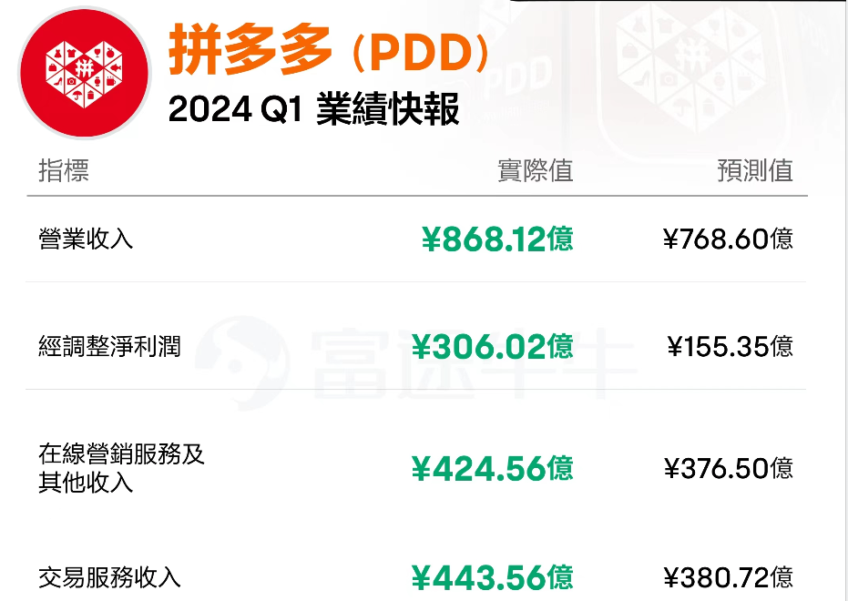 今天下午美股盘前,拼多多发布一季度财报数据,营收、利润相当炸裂,大超华尔街预期。拼多多2024年Q1营收为868亿元,同比增长131%,大大高于市场预期的768亿;经调整利润为306亿元,同比增长202%,远超市场预期的155亿元。